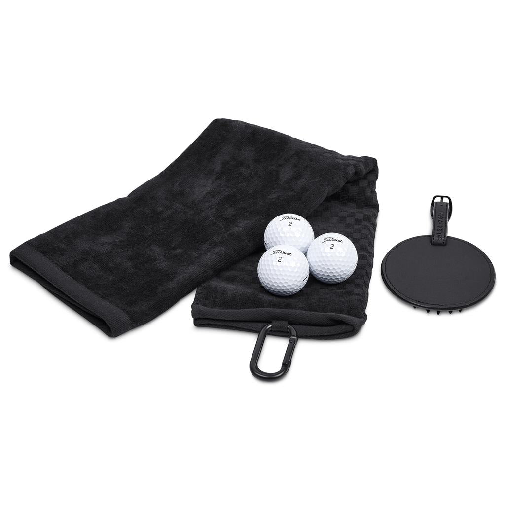 This golf gift set includes a cotton golf towel, divot tool, golf pencil, and six golf tees, all neatly presented in a two‑piece black presentation box. Each set is completed with a sleeve of three golf balls, allowing you to select the option that...
